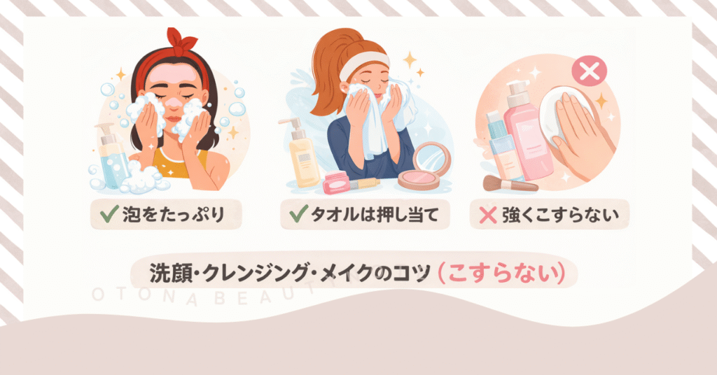 ゴシゴシ洗顔・スクラブ・強めのタオルドライは厳禁。優しく泡で洗い、水かぬるま湯でしっかり流す。